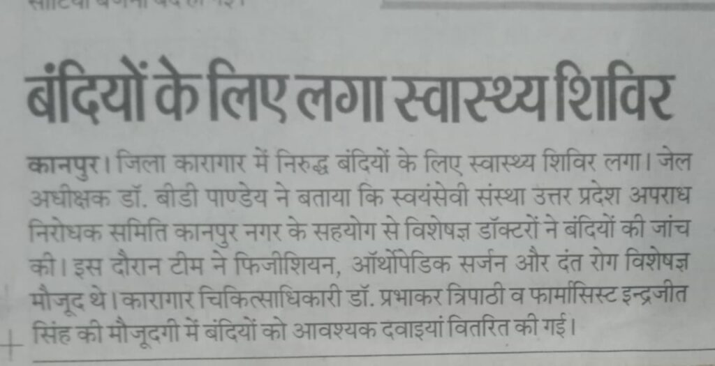 उत्तर प्रदेशीय अपराध निरोधक समिति, लखनऊ के यशस्वी चेयरमैन माननीय श्री कमलेश श्रीवास्तव जी के निर्देशानुसार जिला अपराध निरोधक समिति, कानपुर नगर द्वारा दिनांक 29 जनवरी 2026 को जिला कारागार, कानपुर नगर में एक मेडिकल कैम्प का आयोजन किया गया। मेडिकल कैम्प में ‘‘उ0प्र0 अपराध निरोधक समिति, कानपुर नगर’’ के तत्वावधान में पारस हॉस्पिटल, कानपुर नगर के विशेषज्ञ चिकित्सकों की टीम द्वारा बंदियों का स्वास्थ्य परीक्षण किया गया। चिकित्सकीय टीम में फिजीशियन, ऑर्थोपेडिक सर्जन एवं दन्त रोग विशेषज्ञ शामिल रहे। पारस हॉस्पिटल, कानपुर नगर के पैरामेडिकल स्टाफ द्वारा भी उपस्थित रहकर कैम्प में सक्रिय सहयोग प्रदान किया गया। कारागार चिकित्साधिकारी डॉ. प्रभाकर त्रिपाठी एवं फार्मासिस्ट श्री इन्द्रजीत सिंह राना द्वारा बंदियों का स्वास्थ्य परीक्षण कराया गया तथा आवश्यकतानुसार औषधियों का वितरण किया गया। उ0प्र0 अपराध निरोधक समिति, कानपुर नगर की ओर से श्री विजय वर्मा, श्री सूर्य प्रकाश तिवारी, श्रीमती सरिता गुप्ता, श्री विश्वनाथ गुप्ता, श्री सौरभ साहू एवं श्री रोहित कुमार द्वारा चिकित्सालय स्टाफ एवं कारागार प्रशासन के साथ समन्वय स्थापित करते हुए मेडिकल कैम्प को सफलतापूर्वक सम्पन्न कराया गया। मेडिकल कैम्प के दौरान कारागार अधीक्षक डॉ. बी.डी. पाण्डेय, जेलर श्री मनीष कुमार, डिप्टी जेलर श्री अरुण कुमार सिंह, श्री प्रदीप कुमार सिंह, श्री राजेन्द्र कुमार मिश्र एवं श्री राजीव कुमार उपस्थित रहे।