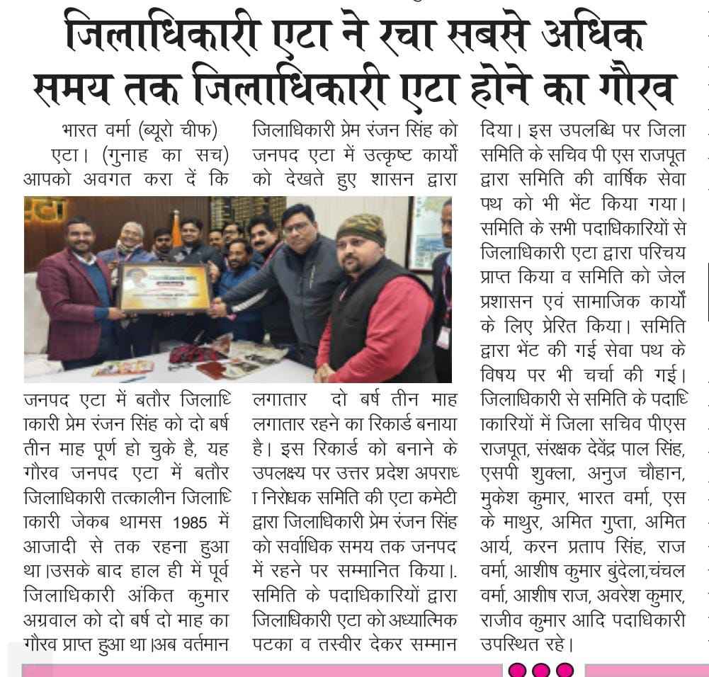 आपको बता दे कि जनपद एटा में बतौर जिलाधिकारी प्रेम रंजन सिंह को दो बर्ष तीन माह पूर्ण हो चुके है, यह गौरव जनपद एटा में बतौर जिलाधिकारी तत्कालीन जिलाधिकारी जेकब थामस 1985 में आजादी से तक रहना हुआ था।उसके बाद हाल ही में पूर्व जिलाधिकारी अंकित कुमार अग्रवाल को दो बर्ष दो माह का गौरव प्राप्त हुआ था।अब वर्तमान जिलाधिकारी प्रेम रंजन सिंह को जनपद एटा में उत्कृष्ट कार्यों को देखते हुए शासन द्वारा लगातार दो बर्ष तीन माह लगातार रहने का रिकार्ड बनाया है।